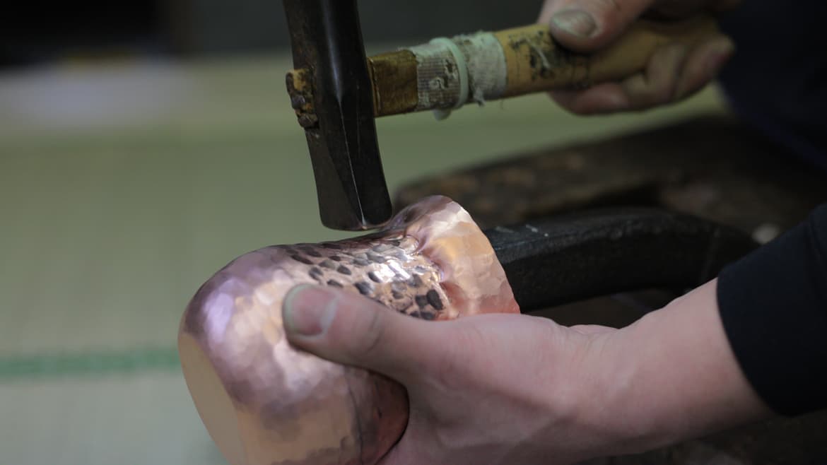 銅板を焼き鈍し 様々な鎚を用いて打延べをし、あるいは打ち縮めたり地金を締め、銅のすぐれた伸展性を利用し鍛金技法を用いて銅製品を作り上げます。絞り縮めて器をつくる伝統技法です。